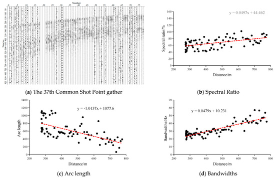 A group of common source point data was selected for preliminary analysis. The measured common shot point gathers and attribute calculation results of the 37th shot are shown in Figure 9.