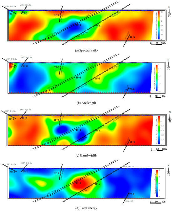 Figure 10a–c illustrate the tomography results for the three-channel wave attribute parameters, whereas Figure 10d depicts the tomography result for the conventional total energy attenuation coefficient. In Figure 10d, three anomalies are predicted. However, TF-1 and TF-3 were not revealed during the actual mining, and the results in Figure 10d indicate false positives. When compared with the Total energy attenuation coefficient tomography, the spectral ratio tomography result (Figure 10a) accurately predicts the faults TF-1, TF-2, TF-4, TF-5, but fails to predict TF-3 and TF-6. The tomography results for the arc length (Figure 10b) successfully predict faults TF-3, TF-4, and TF-5. However, the bandwidth attenuation tomography results (Figure 10c) also successfully predict faults TF-3, TF-4, and TF-5 but fail to predict other faults.