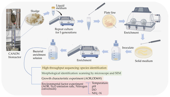 Original sludge was sourced from a stable CANON bioreactor operating in a laboratory (Guizhou, China). The inlet water of the bioreactor is simulated industrial sewage, and its water quality is characterized by high NH4+-N and low C/N ratio. The bacterial strain was introduced into 100 mL of liquid culture medium (Table 1) at an inoculation volume ratio of 2% (v/v). Cultivation was performed in a shaking incubator (VRERA, Shanghai, China) maintained at 30 °C with an agitation rate of 120 r∙min−1, without light throughout the incubation period. Medium pH was adjusted to 8.0 using 1 mol∙L−1 hydrochloric acid (HCl) (Sinopharm Chemical Reagent Co., Ltd., Shanghai, China) and sodium hydroxide (NaOH) (Sinopharm Chemical Reagent Co., Ltd., Shanghai, China) solutions. NO2−-N accumulation was monitored at 24 h intervals. Positive cultures exhibiting significant NO2−-N accumulation were subcultured into fresh medium at a 1% (v/v) inoculation ratio for five consecutive rounds. Subsequently, positive samples were subjected to three rounds of streak/spread plate isolation on solid medium, followed by selection of single colonies for incubation in a shaking incubator (Figure 1). Throughout the experimental period, pH was regularly monitored and maintained at 8.0. For solid medium preparation, 1.5% (w/v) agar was supplemented. The medium was subsequently autoclaved at 121 °C for 30 min and stored until use.