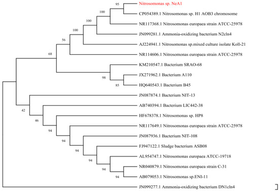 The enrichment culture from a single colony was centrifuged, and genomic DNA was extracted using the Ezup Column Bacterial Genomic DNA Extraction Kit (Shanghai Sangon Biotech, Shanghai, China). PCR amplification was done using the TC1000-G PCR machine (SCILOGEX, Rocky Hill, CT, USA). PCR amplification was performed using primers 27F (5′-AGAGTTTGATCMTGGCTCAG-3′) and 1541R (5′-AAGGAGGTGATCCA GCC-3′) as forward and reverse primers, respectively. The PCR products were verified by 1% (w/v) agarose gel electrophoresis and then sent to Sangon Biotech (Shanghai, China) for sequencing. The sequencing results were analyzed using BLAST (https://blast.ncbi.nlm.nih.gov/Blast.cgi, accessed on 14 November 2023) against the NCBI database, and a phylogenetic tree was constructed using the Neighbor-Joining method implemented in MEGA11.