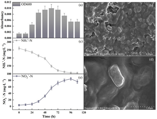 Strain N.eA1 growth status: (a): OD600 value during the growth of strains; (b,d): SEM images; (c): NH4+-N change during the growth of strains; (e): NO2−-N change during the growth of strains.