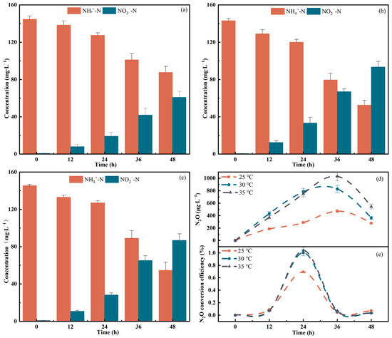 Effect of temperature on N.eA1: (a): NH4+-N and NO2−-N change at 25 °C; (b): NH4+-N and NO2−-N change at 30 °C; (c): NH4+-N and NO2−-N change at 35 °C; (d): N2O emission concentration at different temperatures; (e): the degree of N2O conversion at different temperatures.