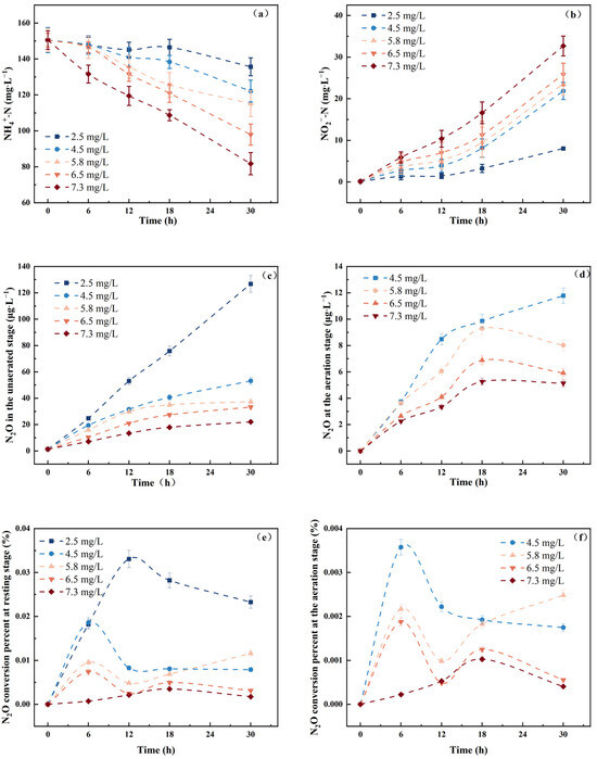 As shown in Figure 5, the consumption of NH4+-N and the accumulation of NO2−-N both increased with the rise in DO concentration. In the non-aerated control group, the NH4+-N conversion percentage at 30 h was 9.8%, with a conversion amount of 14.8 mg·L−1, and the accumulated NO2−-N was 8.0 mg·L−1. At DO concentration of 7.3 mg·L−1, the 30 h conversion rate of NH4+-N reached 45.7%, with a conversion amount of 68.8 mg·L−1, and the accumulation of NO2−-N was 35.7 mg·L−1. The N2O emissions during the aeration stage were significantly lower than those during the unaerated stage. During the unaerated stage, N2O emissions increased over time. However, during the aeration stage, when the DO concentration exceeded 4.5 mg·L−1, N2O emissions peaked between 12 and 18 h and subsequently declined, suggesting that high DO concentrations (>4.5 mg·L−1) could significantly reduce N2O emissions while maintaining high ammonia oxidation efficiency. In the non-aerated control group, the N2O release was relatively lower than in other experimental groups.