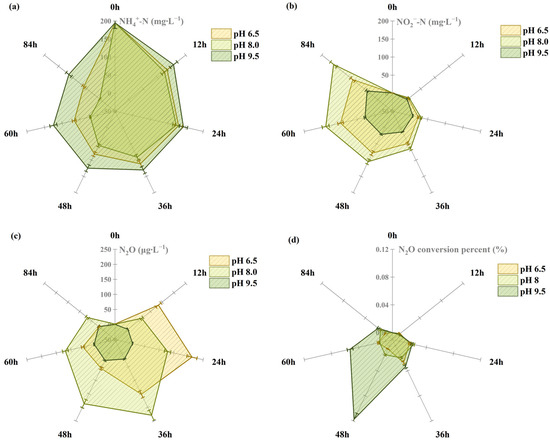 At pH 8.0, the degradation rate of NH4+-N and accumulation rate of NO2−-N reached their maximum values. Within 84 h, 98% of NH4+-N was degraded, while NO2−-N accumulated to 158.1 mg∙L−1. N2O emission peaked between 24 and 36 h, reaching 228.86 μg∙L−1, with a conversion rate of 0.021%. At pH 9.5, the AOR decreased significantly. After 84 h, only 42.1% was degraded, with a conversion amount of 82 mg∙L−1 and NO2−-N accumulation of 39.9 mg∙L−1. This indicates that high pH inhibits the strain’s ammonia oxidation capacity, resulting in significantly reduced N2O emissions. The cumulative N2O release was only 103.8 μg∙L−1, with a maximum conversion rate of 0.017% (Figure 6).