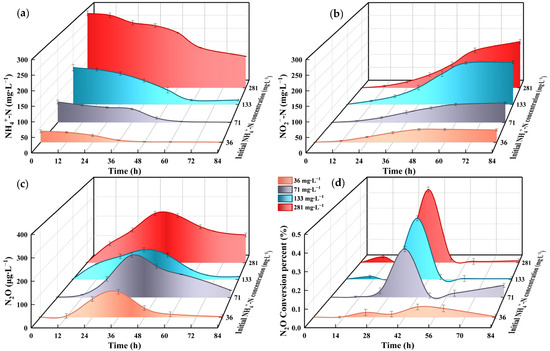 Results are presented as mean values of triplicate experiments with standard deviation (mean ± SD, n = 3). Time series analyses were conducted to evaluate the temporal dynamics of NH4+-N degradation, NO2−-N accumulation, and N2O emissions in different environmental conditions.