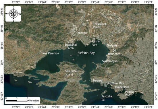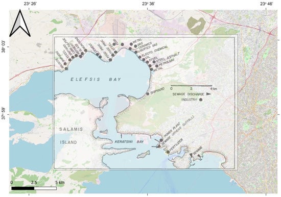 Elefsina Bay was named after the city lying on its coast, 20 km west of the city of Athens. It is an internal gulf in the north of the wider Saronikos Gulf. It is a semi-enclosed basin formed in an E–W direction (Figure 4). The bay area is estimated at 67 km2, with a maximum depth of 33 m, enclosing approximately 1.2 km3 of water. Two narrow entrances allow water exchange with the open sea. The local tides are less than 5 cm in height, and the sedimentation rates range from 0.5 to 0.8 cm/year [64,65]. It is also documented that the lack of strong currents, anoxic conditions, and water stratification, especially during the summer, with a clearly defined thermocline, intensify the pollution problem by favoring the accumulation of sediments and inhibiting the natural destruction/decomposition of pollutants [66]. The largest industrial zone in Greece is located in the northern part of Elefsina Bay, where about 2200 companies have been estimated by the local Development Association (DATP, 2003) to be set on the Thriassion Plain (Figure 2 and Figure 4). Some of the largest industrial compounds in Greece are hosted in the region, such as two oil refineries, two steel industries, two cement factories, one industry of weapon systems, large warehouses, oil distribution facilities, three units of used lubricant processing, one paper mill, chemical industries, and industries and manufacturers of plastic products.