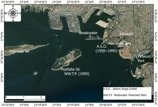 The northern part, named the Inner Saronikos Gulf, receives the treated wastes of approximately 5 million people from the Wastewater Treatment Plant (WWTP) outfall that has been discharged south of Psyttalia Island since 1995 (Figure 3). Before that, from 1950 to 1995, the untreated domestic wastewater and part of the industrial wastewater of Athens municipality had been discharged into the shallow waters (about 30 m) of eastern Keratsini Bay, at rates of ~200,000 m3/day in the 1970s [21,23]. In 1974, a solid breakwater was also constructed, directly north of the outfall, further restricting the already limited circulation in the area [25] (Figure 3). A large sludge field covering approximately 9 and later 13 km2 of the seafloor with black anoxic mud has been reported since 1975 [21,25]. Approximately twenty years later, the total sewage flow discharging to the shallow Keratsini Bay was estimated to be about 600,000 m3/day [27,59]. The effect of the sewage discharge was largely imprinted in the marine environment; it provoked a dramatic loss of clarity in the ambient water, as well as a repulsive odor and the accumulation of organic-rich sediments on the seafloor [27,59]. The industries that were discharging wastewater through the Athens Sewage Outfall during the 1970s are presented in Table S1_1 (Supplementary File_S1).