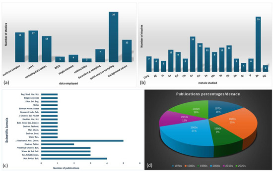 The 33 selected articles are distributed across 21 journals, with most articles obtained from Marine Pollution Bulletin, Science of the Total Environment, Water, Air, & Soil Pollution, and Journal of Radioanalytical and Nuclear Chemistry (Figure 6c). In addition, the following were extracted from the articles: authors, year, specific Saronikos region, and metals under investigation. After downloading, the articles were read in full to obtain the data.