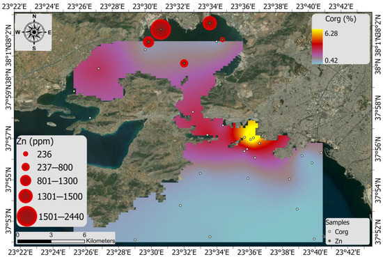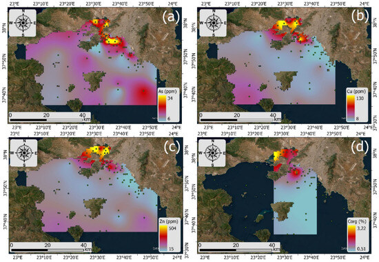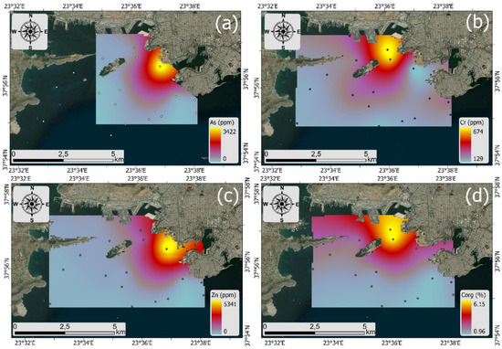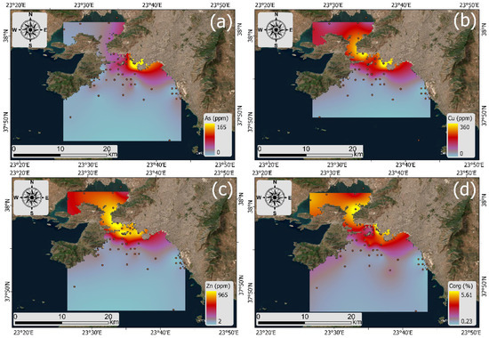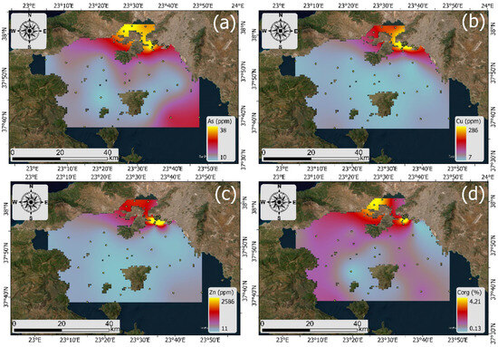 The ArcGIS Pro 3.2 software (ESRI Inc., Redlands, CA, USA) Kriging interpolation tool was used in this investigation to illustrate the levels of heavy metals present on the Saronikos Gulf seafloor. This method is commonly used to estimate the unknown spatial scale of sediment data from the known data of sites that are adjacent to the unknown sites [69].