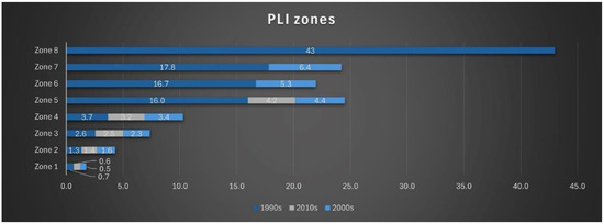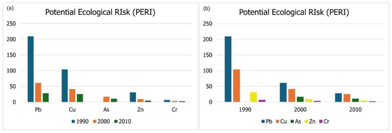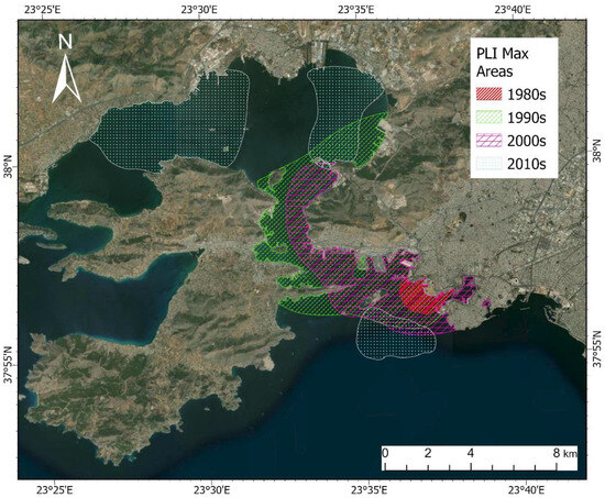 Heavy metal concentrations obtained from the 14 research papers were used to estimate the ecological profile of the Saronikos Gulf per decade. The ecological risks caused by heavy metals in the sediments of the Saronikos Gulf were evaluated using the Pollution Loading Index (PLI) [70]. The PLI provides an assessment of the sediments’ overall toxicity level. Additionally, the Potential Ecological Risk Index, introduced by Hakanson [71], was used, and the human risk was calculated through ingestion and dermal contact using the Human Health Risk Assessment [20,72,73,74]. As surface sediments can act as both sinks for metals and secondary contaminants in aquatic ecosystems, it is important to understand the exposure risk of heavy metals for people (especially fishermen and consumers of local fish, from both pathways and mainly through ingestion) living in the coastal area and for the coastal reclamation [47]. Additionally, Kumar et al. [75] conducted a review of data on the heavy metals in sediments from India and performed a Human Health Risk Assessment based on these data. Wang et al. [76] evaluated the non-carcinogenic risks associated with nine heavy metals across various sediment types (mud, mud–sand, and sand) collected from seven estuarine wetlands in four coastal provinces of China. These recent studies underscore the exposure to human health risks posed by heavy metals, even in estuarine sediments, and emphasize the importance of assessing the non-carcinogenic risks linked to surface sediments in relation to human health.