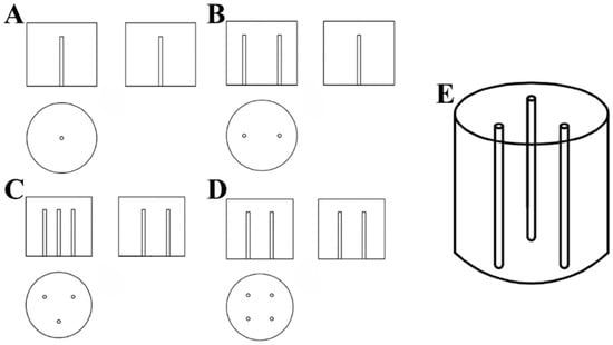 In this experiment, a UV lamp with a 254 nm wavelength (the maximum absorption wavelength of CTL was 232 nm) (Supplementary Figure S1) was utilised as the light source. The lamp tube measured 212 mm in length and had a power output of 10 W. It was fully sealed within a quartz tube, allowing it to be safely immersed in water while maintaining stable light output. This configuration guaranteed the uniformity of UV radiation throughout the experiment, thereby optimising conditions for photochemical reactions. The reaction vessel was a white enamel bucket made of cast iron, coated with an enamel glaze for strong resistance to acids and alkalis and ease of cleaning. Buckets with diameters of 20 cm, 30 cm, and 40 cm were utilised to accommodate varying volumes of reaction solution. For the UV irradiation experiments, a CTL standard solution was diluted to a target concentration of 1.88 μmol/L (the maximum solubility of CTL in water is 0.6 ppm) [34]. The reaction solution volume was adjusted to ensure the UV lamp was fully submerged, thereby facilitating uniform and comprehensive irradiation. The experimental design regulated the installation of the UV lamp, ensuring uniform light distribution and enhancing the precision of the experiment. The configurations are outlined below: Single-Lamp Configuration Figure 1A: A single UV lamp was installed vertically at the centre of the enamel bucket, providing a centralised light source that served as the control for comparative analysis with other configurations. Two-Lamp Configuration Figure 1B: Two UV lamps were installed vertically at the midpoint of the circle’s radius. This configuration ensured uniform illumination over a larger reaction area while maintaining high light intensity at the centre. Three-Lamp Configuration Figure 1C,E: Three UV lamps were installed vertically at the midpoint of the lines connecting the vertices of an equilateral triangle to the centre of the circle. This configuration aimed to achieve more balanced UV distribution and assess the impact of uneven light exposure on the reaction rate. Four-Lamp Configuration Figure 1D: Four UV lamps were installed vertically at the midpoint of the lines connecting the vertices of a square to the centre of the circle. This configuration enhanced irradiation uniformity and ensured comprehensive coverage of a wider reaction area. A mechanical stirrer operating at 240 r/min was utilised to ensure a uniform flow of the reaction solution. This configuration was designed to replicate the dynamic conditions typically observed in natural water bodies, thereby ensuring uniform exposure to UV light while preventing localised shading due to stagnant liquid. To investigate the effect of reflective surfaces on UV irradiation, two types of aluminium foil were applied to the inner walls of the UV light boxes: black and silver-white. The black aluminium foil minimised light reflection, while the silver-white foil, with its high reflectivity, enhanced UV light efficiency. These configurations, designated as black aluminium foil boxes and silver-white aluminium foil boxes, respectively, facilitated a comprehensive study of how different reflective properties influence the photocatalytic degradation of CTL. The light intensity of different diameters of barrels and different inner wall materials irradiated by different amounts of ultraviolet lamps is shown in Table 1. The specifications of the materials used are in accordance with Supplementary Table S1.