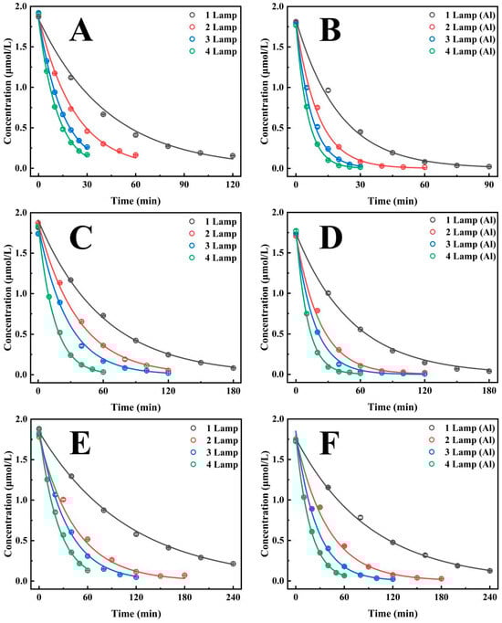 The effect of installing 1, 2, 3, and 4 UV lamps in containers of different sizes on the photocatalytic degradation efficiency of CTL: (A) The diameter of the container was 20 cm. (B) The container has a diameter of 20 cm and was attached with silver-white aluminium foil. (C) The diameter of the container was 30 cm. (D) The container has a diameter of 30 cm and was attached with silver-white aluminium foil. (E) The diameter of the container was 40 cm. (F) The container has a diameter of 40 cm and was attached with silver-white aluminium foil.