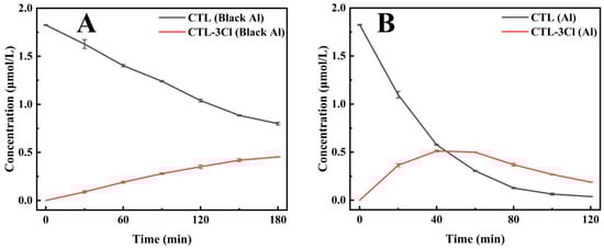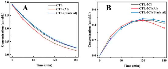 The impact of black aluminium foil containers (Black Al) on the degradation of CTL and its product CTL-3Cl (A). The impact of silver-white aluminium foil containers (Al) on the degradation of CTL and its product CTL-3Cl (B).