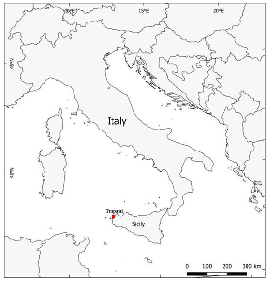 Map of the sampling site created using the QGIS software v.3.6, using the layer “ne_10m_admin_0_scale_rank_minor_islands.shp” freely available at http://www.naturalearthdata.com/downloads (accessed on 1 February 2025). The red circle indicates the sampled point.