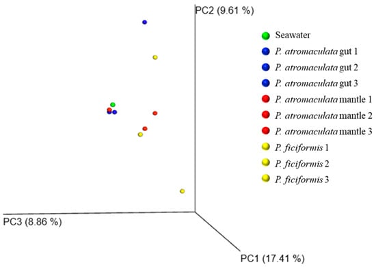 Principal Coordinate Analysis (PCoA) plot of the seawater, gut and mantle of P. atromaculata, and P. ficiformis samples analyzed using Bray–Curtis similarity.