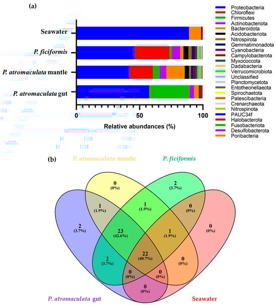 (a) Bar plots of the percentage of the average relative abundances of the leading 25 phyla found in seawater, P. atromaculata gut, P. atromaculata mantle, and P. ficiformis. Data are shown as the means from samples (n = 3) of the same type, excluding control samples (i.e., seawater). (b) The Venn diagram shows the distribution of the phyla in the seawater, P. atromaculata gut, P. atromaculata mantle, and P. ficiformis.