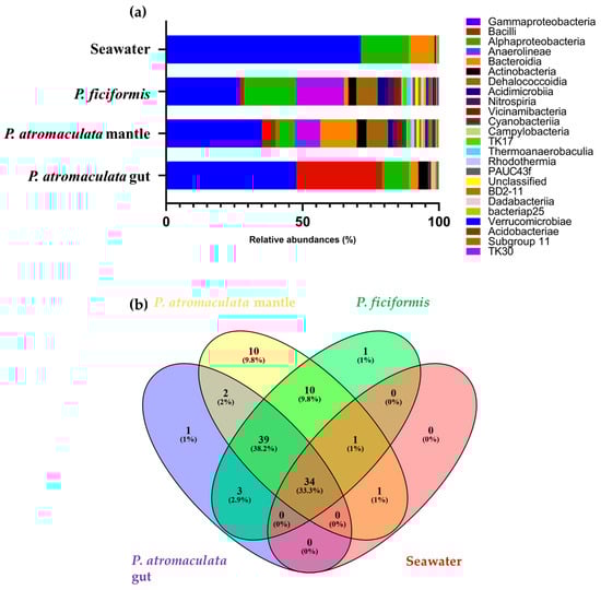 (a) Bar plots of the percentage of the average relative abundances of the leading 25 classes found in seawater, P. atromaculata gut, P. atromaculata mantle, and P. ficiformis. Data are shown as the mean from samples (n = 3) of the same type, excluding control samples (i.e., seawater). (b) The Venn diagram shows the distributions of the classes in the seawater, P. atromaculata gut, P. atromaculata mantle, and P. ficiformis.