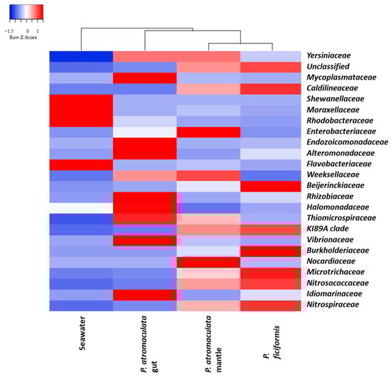 Heatmap based on the main 25 families detected in the studied samples (seawater, P. atromaculata gut, P. atromaculata mantle, and P. ficiformis), generated by “Average” calculation using the Euclidean linkage. Data are shown as the means from samples (n = 3) of the same type, excluding control samples (i.e., seawater).