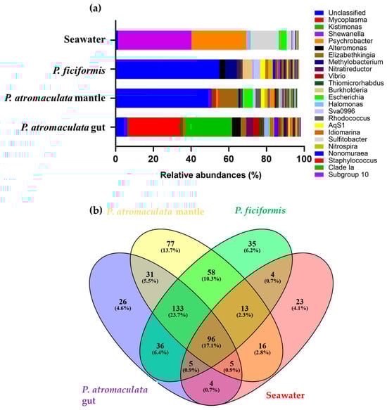 (a) Bar plots of the percentage of the average relative abundances of the leading 25 genera found in the seawater, P. atromaculata gut, P. atromaculata mantle, and P. ficiformis. Data are shown as the means from samples (n = 3) of the same type, excluding control samples (i.e., seawater). (b) The Venn diagram shows the distributions of the genera in the seawater, P. atromaculata gut, P. atromaculata mantle, and P. ficiformis.