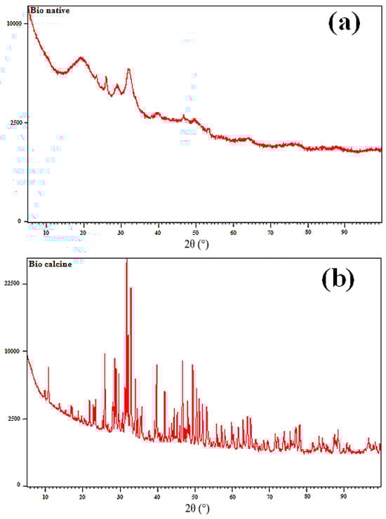 The XRD analysis of the NBio and CBio samples is presented in Figure 1, providing valuable insight into the crystallographic structure of both the native and calcined biomasses. The diffractogram of the NBio shown in Figure 1a reveals a broad peak at 19.8°, which can be associated with the amorphous phase of the sample. Additionally, two broad peaks are observed at 25.9° and 32.22°, which correspond to the (002) and (211) planes, respectively, as previously reported for hydroxyapatite (HAP) (JCPDS cards for XRD analysis) [54]. These peaks are characteristic of hydroxyapatite’s crystalline structure, albeit in a less defined form due to the presence of amorphous materials in the native biomass. The peak at 29.22° further indicates the presence of calcite, suggesting that the native biomass contains a mixture of mineral phases.