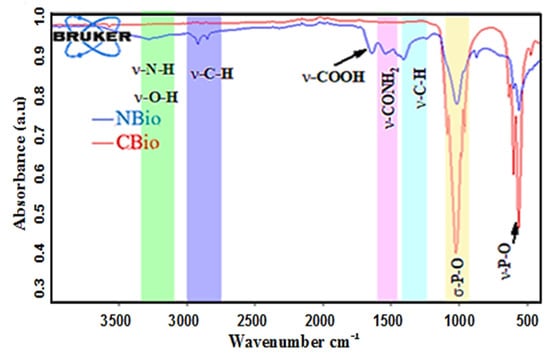 In the spectrum of the NBio, shown in Figure 2 (in blue), a broad band near 3278.33 cm−1 is observed, corresponding to the stretching vibrations of hydroxyl (O-H) and amine (N-H) groups. This band is characteristic of the presence of moisture and certain functional groups in the organic matrix of the bone. The bands at 2922.18 cm−1 and 2853.51 cm−1 are due to the C-H stretching vibrations of the alkyl groups (CH3 and CH2), which are associated with the fats present in the native biomass. These fatty acids and other lipids are part of the organic content of the chicken bone before calcination. The peak at 1458.24 cm−1 is related to the C-H deformation vibrations of the CH3 groups, along with the C-O stretching of the carbonate groups [55], further indicating the presence of organic and mineral components in the native bone.