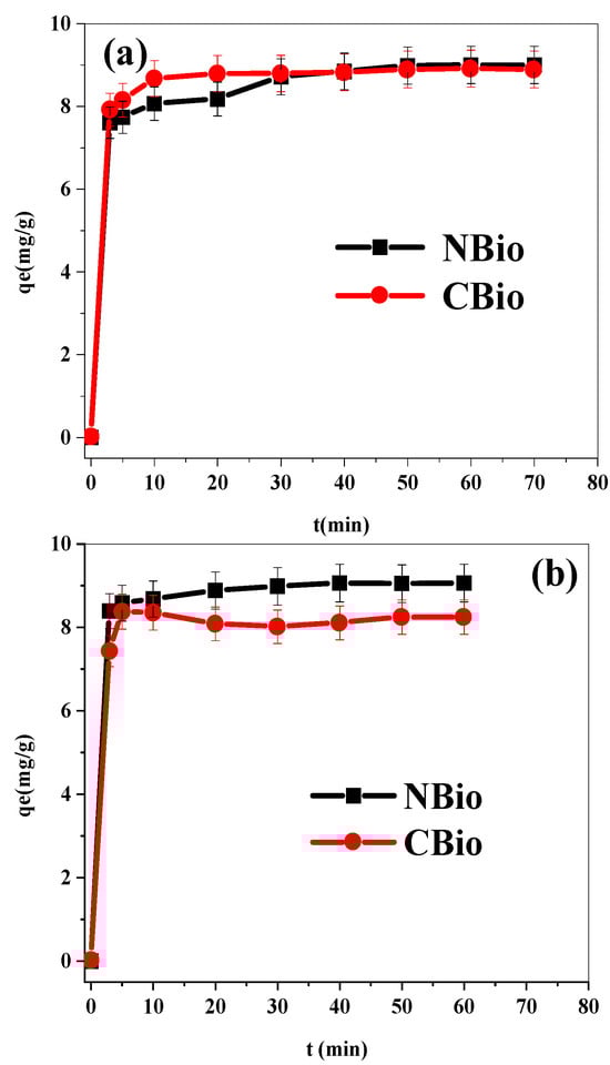 Impact of the contact time on BF (a) and MB (b) biosorption.
