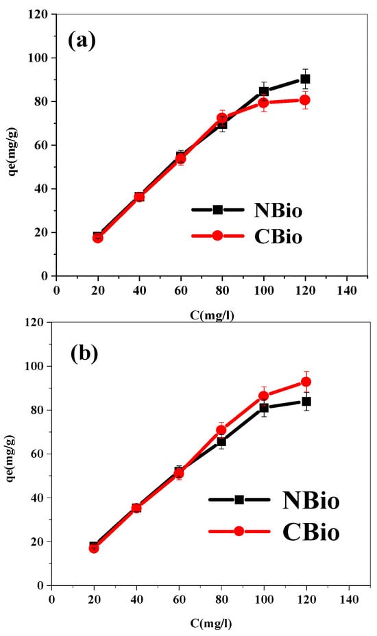 In Figure 5, the biosorption capacity for both NBio and CBio demonstrates a clear positive correlation with the initial concentrations of BF and MB. This trend is attributed to the higher availability of biosorption sites compared to the concentration of dye molecules in the solution. As the concentration of the dyes increases, more molecules diffuse from the solution to the adsorbent surface, resulting in an enhanced adsorption rate. The initial phase of biosorption is rapid, as there are plenty of unoccupied sites for the dye molecules to bind. However, as more dye molecules are adsorbed, the adsorption rate starts to decrease as the available surface sites become increasingly occupied.