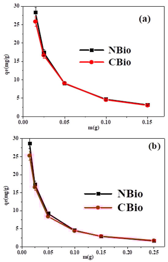 The effect of contact time on the biosorption capacities of BF and MB by NBio and CBio was evaluated using an initial dye concentration of 10 mg L−1, a solution volume of 50 mL, and 0.05 g of adsorbent, all maintained at room temperature. The final concentrations of BF and MB were measured at different time points (ranging from 3 to 70 min) using a UV–visible spectrophotometer at 574 nm and 676 nm, respectively. To investigate the influence of initial dye concentration on the biosorption capacity, the concentration was adjusted between 20 and 140 mg L−1 in increments of 20 mg L−1. The effect of the adsorbent mass was studied within the range of 0.015 to 0.25 g, with an initial dye concentration of 10 mg L−1, a dye solution volume of 50 mL, and no pH adjustment. The effect of the biosorbent/adsorbate ratio was examined by varying the amounts of NBio (0.01–0.15 g) or CBio (0.01–0.25 g), while keeping the dye volume and concentration constant. The adsorption capacities, Qe (mg g−1), for BF and MB on NBio and CBio were calculated using Equation (4).