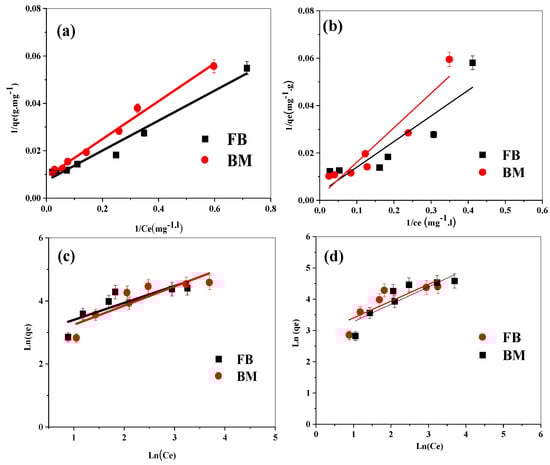 The relationship between the adsorbate concentration in the liquid phase (Ce) and the equilibrium adsorbed amount (Qe) is described by the Langmuir and Freundlich adsorption isotherms. The linearized forms of these two models are given by Equations (8) and (10), respectively.