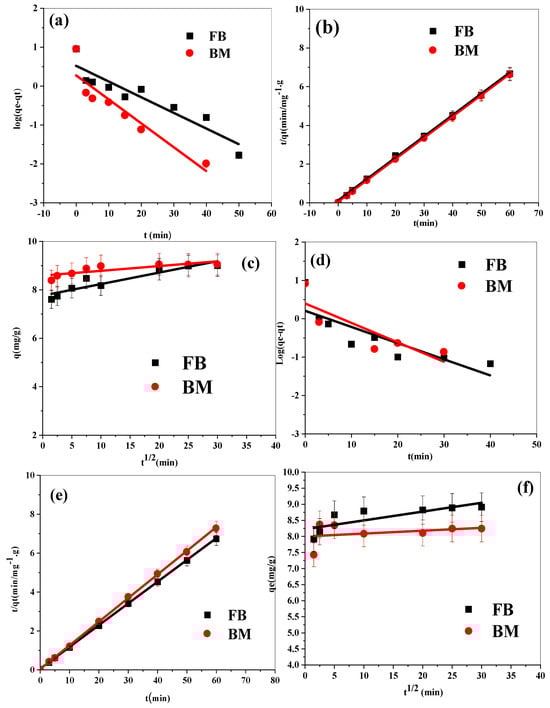 In summary, the adsorption process progresses through three stages. Initially, rapid adsorption occurs as there are abundant free sites for the adsorbate molecules. As more molecules adsorb, the process slows down due to the occupation of surface sites and the repulsive forces between adsorbate molecules. Finally, the process reaches equilibrium when the adsorbent surface is saturated with adsorbate molecules, and no further adsorption takes place. These observations confirm that the biosorption of BF and MB on NBio and CBio follows a well-defined kinetic pattern with clear phases of rapid adsorption, slowing as sites fill, and eventual equilibrium. The adsorption capacities at equilibrium provide valuable information for the potential application of these biosorbents in real-world adsorption processes.
