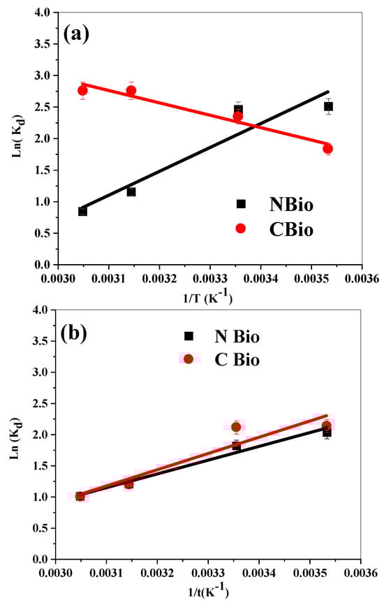 To assess whether the adsorption of MB and BF onto native and calcined biomasses occurs spontaneously, the biosorption process was carried out at various temperatures. The thermodynamic parameters, including free energy change (∆G), enthalpy change (ΔH), and entropy change (ΔS), were evaluated using the Van’t Hoff equation. The relationship between the equilibrium constant (Kd) and temperature (T) was determined by plotting the natural logarithm of Kd against the reciprocal of the temperature (1/T). These thermodynamic parameters provide insights into the nature of the adsorption process, including its spontaneity, the heat involved, and the disorder or randomness associated with the process. The Van ’t Hoff equation, Equation (11), was applied to calculate these values and further understand the thermodynamic feasibility of the biosorption process [51].