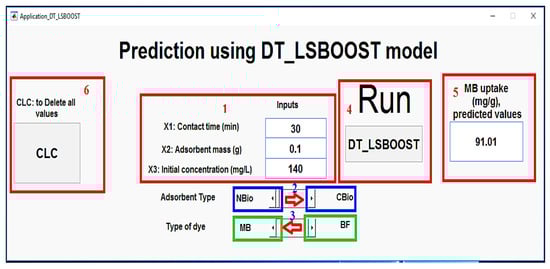 In this study, DT_LSBOOST was used to predict the adsorption capacity of NBio and CBio chicken biochars for the removal of MB and BF dyes. The adsorption process was modeled using critical experimental parameters: contact time (X1), adsorbent mass (X2), and dye concentration (X3) as input variables, while the adsorption capacity served as the output. To make the model broadly applicable to both adsorbents and dyes, two additional categorical inputs were included. The type of adsorbent (X4) was coded as “1” for CBio and “2” for NBio, and the type of dye (X5) was similarly coded as “1” for MB and “2” for BF. These adjustments allowed the model to integrate differences in adsorbent properties and dye behavior into a unified predictive framework.