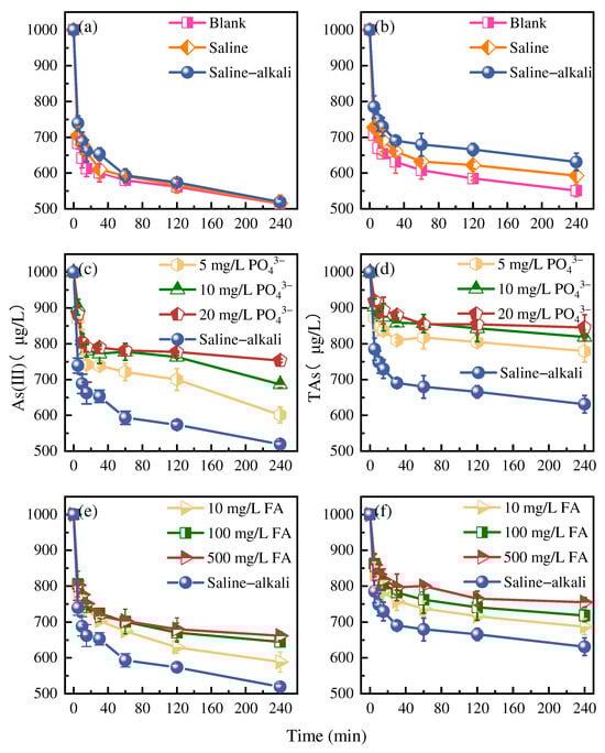 The As adsorption kinetics of goethite in (a,b) saline and saline–alkali environments, (c,d) saline–alkali + PO43−, and (e,f) saline–alkali + FA systems. As(III) = 1 mg/L, goethite dosage = 1 g/L, and initial pH = 8.5 ± 0.1.