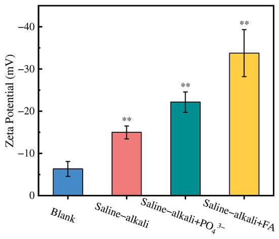 The zeta potential of goethite surfaces after reactions. As(III) = 1 mg/L, goethite dosage = 1 g/L, initial pH = 8.5 ± 0.1, PO43− = 20 mg/L, and FA = 500 mg/L. ** p < 0.001.