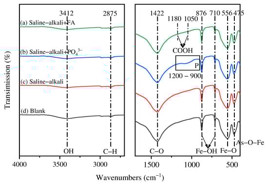 The functional groups on the surface of goethite changed in a saline–alkali environment in the presence of PO43− and FA (Figure 3). The peak near 3412 cm−1 was attributed to surface-bound H2O molecules [42] and the weak peak at 2875 cm−1 was caused by C–H stretching vibrations [43]. The characteristic band observed at approximately 556 cm−1 was identified as corresponding with the vibrational mode of the iron–oxygen covalent bond [44]. The characteristic infrared absorption bands observed at wavenumbers 876 and 710 cm−1 were assigned to hydroxyl group deformation vibrations in the α-FeO(OH) crystalline structure, confirming the presence of goethite in the analyzed sample [45]. The peak at 475 cm−1 was attributed to the complexation of As and iron oxides, which proved that As was adsorbed on the surface of the goethite [46]. The peak near 1422 cm−1 belonged to the carbonate species [47], which was caused by the formation of inner-sphere complexes on the surface of the goethite [48]. The presence of carbonate characteristic peaks was also observed in the control group without HCO3−, which was mainly due to the adsorption of CO2 in the air on the surface of the goethite [49].
