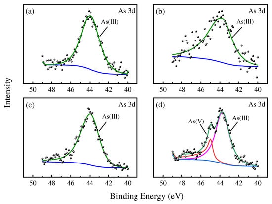 The frequency of PO43− molecules was in the range of 900~1200 cm−1, which was mainly adsorbed on the surface of the goethite through the bidentate coordination of bridge bonds and monoprotonated monodentate coordination [50]. The weak peaks near 1050 and 1180 cm−1 represented the C-O-C bond and O-H bond, respectively, indicating C-O stretching and O-H deformation in the carboxyl group [40]. This phenomenon indicated that FA had complexed with goethite, affecting the adsorption of As(III) in the goethite via competitive adsorption.