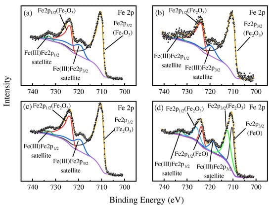 Goethite Fe 2p XPS plots: (a) goethite, (b) saline–alkali environment, (c) saline–alkali + PO43−, and (d) saline–alkali + FA systems.