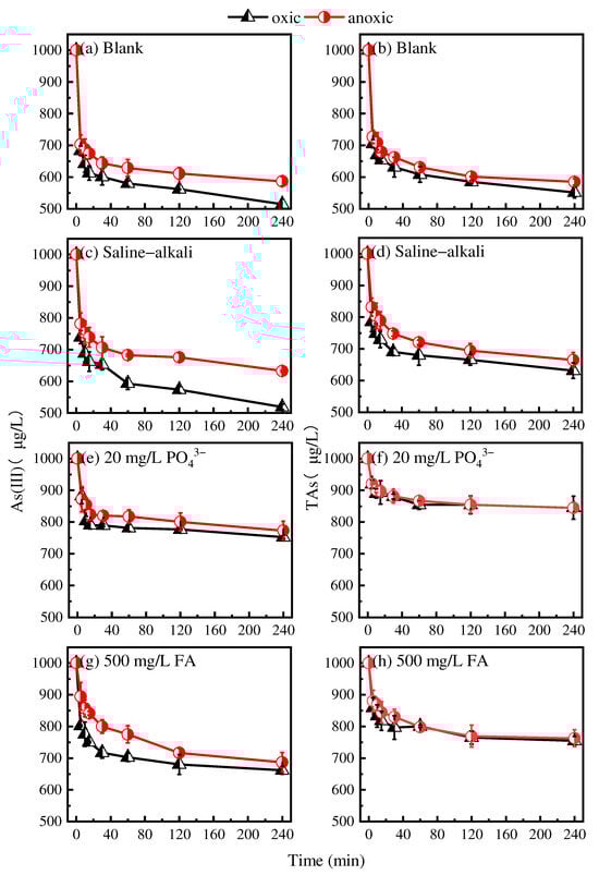 The As(III) and TAs adsorption kinetics of goethite in (a,b) blank, (c,d) saline–alkali, (e,f) saline–alkali + 20 mg/L PO43−, and (g,h) saline–alkali + FA addition systems under oxic and anoxic conditions. Initial As(III) = 1 mg/L, goethite dosage = 1 g/L, and initial pH = 8.5 ± 0.1.