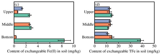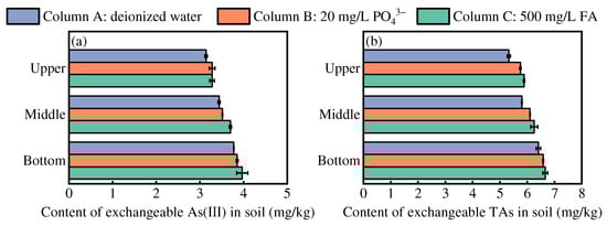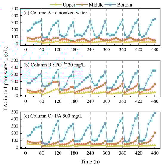 Further studies revealed that, compared with Columns A and B, a large amount of exchangeable Fe accumulated on the bottom soil surface of Column C (Figure 8). The contents of exchangeable Fe and As in each layer of soil in Column C were greater than were those in Columns A and B, indicating that FA could promote the reduction and dissolution of Fe. Dissolved Fe and As in the pore water migrated to the bottom of the soil column with irrigation water. The previous study (Section 3.1.3) revealed that goethite could be reduced to Fe(II) by FA and that partially dissolved Fe(II) was transferred to a lower layer with irrigation water. Owing to the DO carried by the irrigation water, As(III) was oxidized to As(V) by Fe(II) and the formed Fe(III) reattached to the underlying soil. Moreover, the anoxic environment of the lower soil promoted the release of As(V) [59] and reduced the adsorption capacity of As(V) through the high negative charge on the surface of the iron minerals [60]. Therefore, when FA was added to the irrigation water, the fluctuation range of the TAs content in the soil pore water gradually increased with an increase in irrigation time.