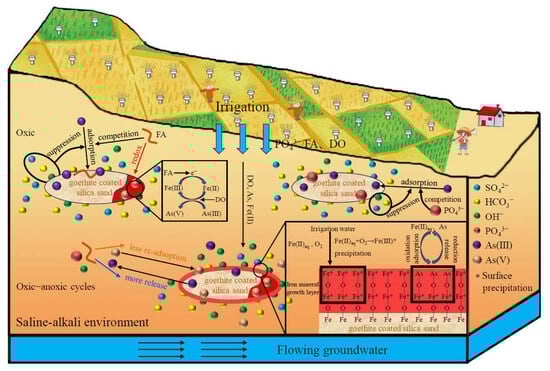 Irrigation activities significantly affected As mobilization and transformation in saline–alkali environments. In an aqueous environment, the adsorption capacity of As(III) by goethite was inhibited in a saline–alkali environment. The inhibitory effect was more significant after the addition of PO43− or FA and the inhibitory effect of PO43− was stronger than that of FA. Notably, anoxic conditions inhibited the adsorption of As(III) by goethite. The surface charge of goethite decreased and the oxidation of As(III) decreased under anoxic conditions. Therefore, the adsorption of TAs by goethite in the presence of PO43− or FA was not affected by a change in the redox environment.