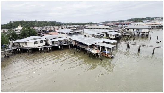 The Brunei River is the shortest and most polluted major river in Brunei Darussalam, spanning approximately 41 km [12], which flows through Brunei Muara (Figure 1). Despite its relatively short length, it plays a critical role in the ecology and socio-economic structure of the Brunei Muara District, the smallest but most populous district in the country. The river traverses Bandar Seri Begawan, the nation’s capital, and supports traditional settlements such as Kampong Ayer (Figure 1), a stilted water village. Its hydrology is shaped by tropical climatic conditions, tidal influences, surrounding topography, and human activities.