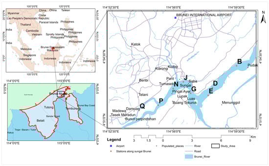 Eight monitoring stations (B, D, E, G, J, N, P, Q) were strategically selected along the Brunei River (coordinates: 4°52′–4°56′ N, 114°54′–115°0′ E) based on their proximity to both point source and non-point source pollution areas (Figure 2).