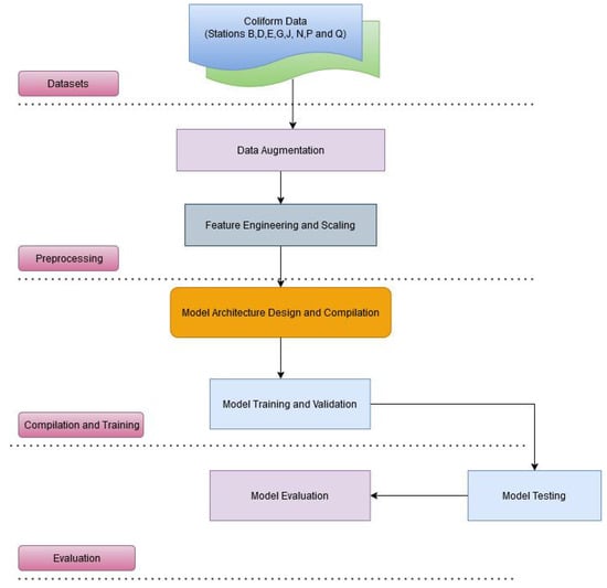 For total coliform future prediction and trends, we first employed a Long Short-Term Memory (LSTM) model, a type of recurrent neural network (RNN) specifically designed to capture long-term dependencies in time series data [52]. LSTM models are well suited for time series forecasting because of their ability to retain information over extended sequences, making them ideal for modeling sequential data where past values may influence future outcomes. Coliform time series data from the eight stations (B, D, E, G, J, N, P, and Q) underwent comprehensive preprocessing. MinMaxScaler was applied to normalize the data to a range between 0 and 1, optimizing the performance of the LSTM model [53]. This normalization is a critical step for improving the convergence of the LSTM model during training.