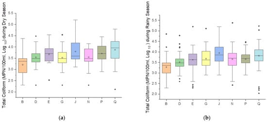 The two box plots (Figure 4a,b) present a comparative analysis of total coliform concentrations across the eight sampling sites during the rainy and dry seasons. For this study, February, March, April, August, and September were categorized as the dry season. These months typically experience fewer rainy days and lower overall precipitation levels. In contrast, January, May, June, July, October, November, and December were categorized as the rainy season.