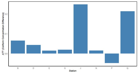 Average Treatment Effect on the Treated (ATT) for coliform concentrations at eight monitoring stations (B, D, E, G, J, N, P, and Q) along the Brunei River.