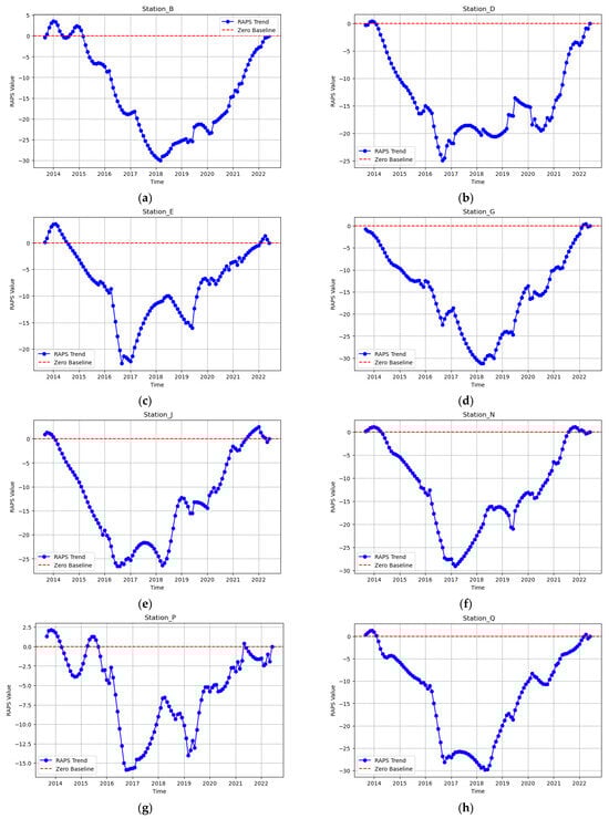 (a–h) RAPS trend at the eight monitoring stations from 2013 to 2022.
