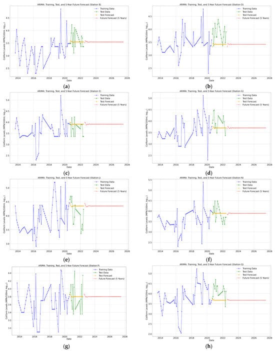 We also utilized the Autoregressive Integrated Moving Average (ARIMA) model to forecast coliform concentrations for the next five years across eight monitoring stations (B, D, E, G, J, N, P, and Q). Time series data for each station, spanning from September 2013 to June 2022, were preprocessed to ensure temporal consistency and completeness. Each station’s dataset was sorted and split into training (80%) and testing (20%) subsets. Stationarity was assessed using the Augmented Dickey–Fuller test [36], and differencing was applied where necessary to stabilize the series. The ARIMA model parameters (p, d, and q) for each station were determined through autocorrelation and partial autocorrelation analysis [36], with the best-fitting model selected for each dataset. The models were fitted to the training data, and testing data forecasts were generated for validation. Performance metrics, including the Mean Absolute Error (MAE), Mean Squared Error (MSE), Root Mean Squared Error (RMSE), and R-squared, were calculated to evaluate predictive accuracy. Using the validated models, 60-month forecasts were generated for each station, representing the expected coliform concentrations over the next five years. Future dates were created to align with the forecast horizon, and the results were plotted alongside historical data to visualize trends and assess potential future water quality risks at each station.