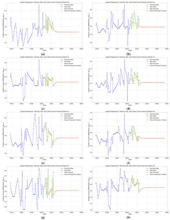 Logistic Regression was used to forecast coliform concentrations at eight monitoring stations (B, D, E, G, J, N, P, and Q) over a 5-year period, using time series data from September 2013 to June 2022. The dataset for each station was sorted by date, and a lag feature representing the previous observation was created to serve as the predictor variable [37]. Missing values resulting from this lag operation were removed to ensure data consistency. The data were split into training and testing subsets, with 80% allocated for training the model and 20% reserved for testing and validation. Logistic Regression models were developed for each station, with the lagged coliform values as the independent variable and the observed concentrations as the dependent variable. The models were trained on the historical data and validated using the testing subset. Model performance was evaluated using metrics such as Mean Absolute Error (MAE), Mean Squared Error (MSE), Root Mean Squared Error (RMSE), and R-squared (R2) to assess accuracy and generalization. Future forecasts for the next 60 months were generated using a recursive approach [37], where each new prediction served as input for the subsequent forecast.