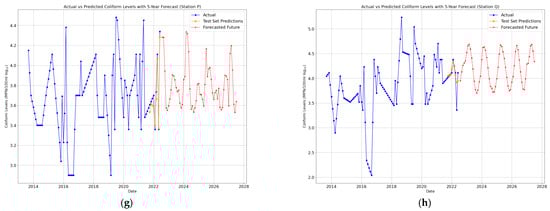 (a–h) BiLSTM 5-year future predictions of total coliform bacteria in the Brunei River.