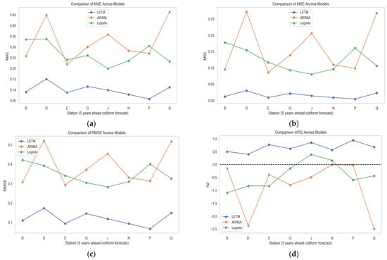 Each model was chosen for its ability to analyze and predict temporal trends of a small dataset. ARIMA utilized the historical patterns and seasonality in the time series, Logistic Regression relied on lagged features to predict coliform levels, and BiLSTM leveraged deep learning to model non-linear relationships and capture long-term dependencies. Furthermore, key performance metrics (Figure 10a–d) and Table A1, Table A2 and Table A3 (see Appendix A), including Mean Absolute Error (MAE), Mean Squared Error (MSE), Root Mean Squared Error (RMSE), and R-squared (R2), were compared to evaluate the models’ accuracies across each monitoring station.